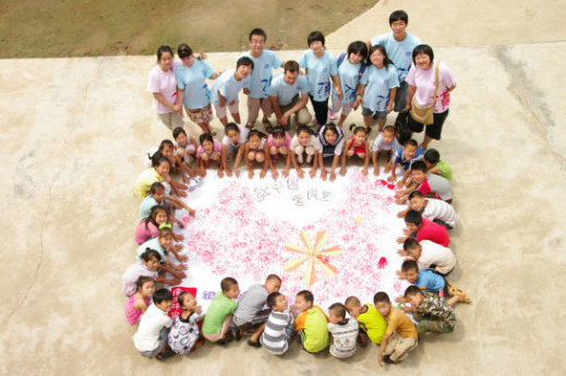 孩子们用手中的彩笔描绘出“红中国,金周至”、 “祖国好,家乡美”的字样,并涂画出写有“陕西师大、南大坪小学”字样的友谊印章。从周至县辐射出的金色光芒,是支教团教师共同创意的结晶,不仅代表了师大学子相聚周至县的缘分,代表了周至凝聚了我们共同的关注——科技、文化、知识的广泛传播,更寄予了“少年强则国强,少年智则国智”,大学生服务农村经济文化发展的强烈愿望与使命。