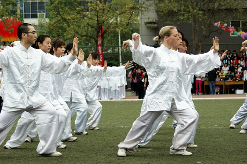 七名留学生与2008级对外汉语专业部分学生组成的太极拳方阵表演,力拔头筹,取得全校第一名的好成绩。