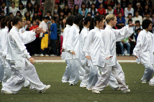 2009级政府奖学金生杨华星(美国)同学担任了太极拳方阵教练。杨教练在指导中,认真负责,态度严谨,技术精湛,得到大家一致的认可。中外学生们克服上课时间不一致等困难,利用节假日和课余时间,虚心学习,互相纠错,共同练习。在一起训练的日子里,来自美国、韩国、比利时、蒙古国、越南、哈萨克斯坦、中国的同学们结下了深厚的友谊。
