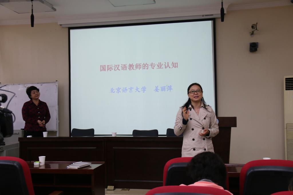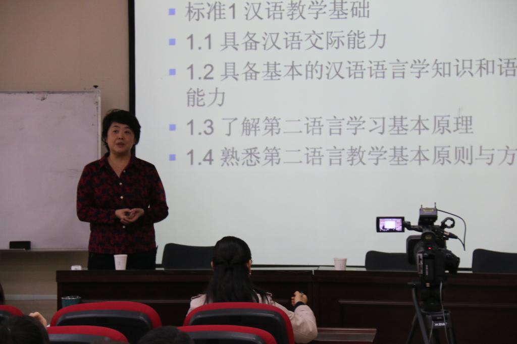最后,姜丽萍教授从理论的角度,分析了教师在教学中的作用,并向在场的师生提出了几点建议:作为一名优秀的国际汉语教师要永葆对这份事业的热爱之情、积极投入并且用心做好它;努力将自己的理论联系实际;培养个人综合素养;坚持写教学日记;将科研与实践相结合等。