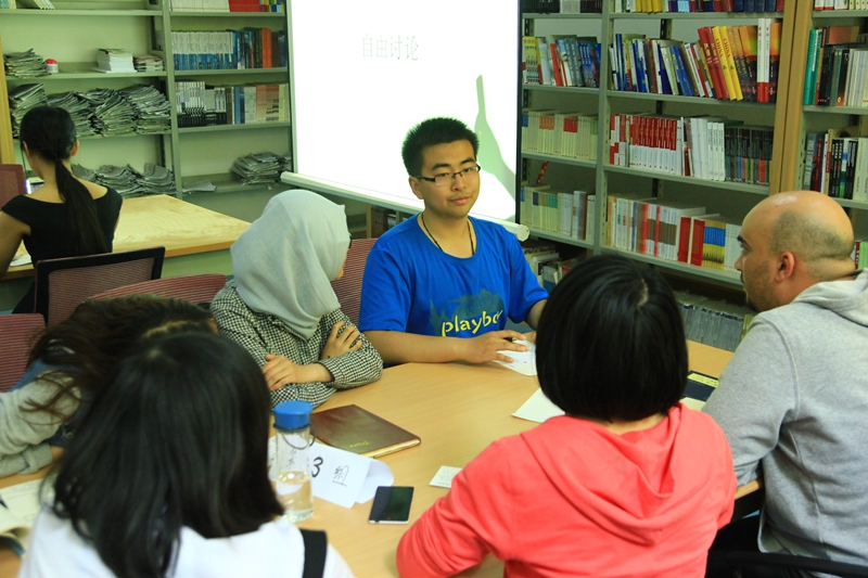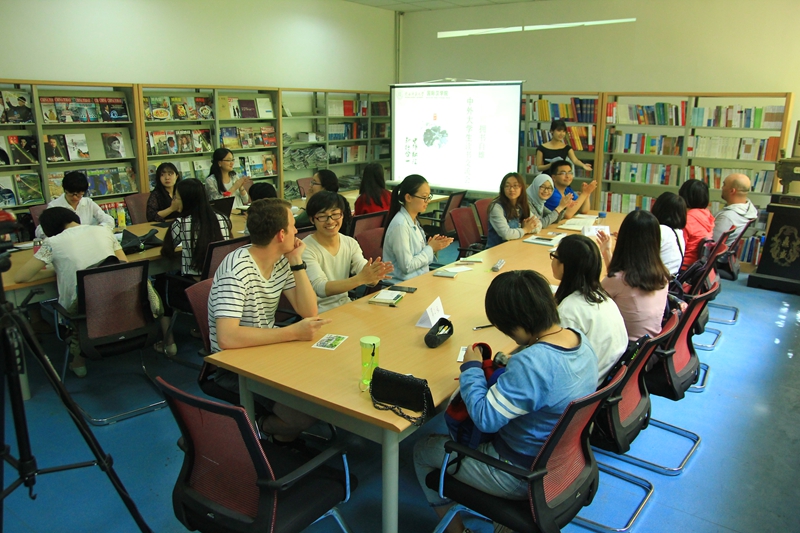 阅览室举行。来自摩洛哥的留学生尤纳斯和来自美国富布莱特项目的留学生康宁森、李博雅一起,与汉语国际教育专业的19名中国学生就阅读的相关话题进行了深入的交流。