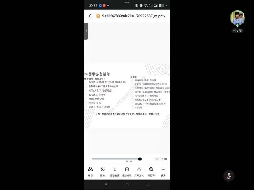 在韩国任教的付梦薇同学从“衣、食、住、行、教”等方面进行了细致入微的分享。她建议出发前可适量携带符合个人口味的调料与速食,并提前了解当地常用的生活APP与购物渠道。在教学方面,她结合实例,提醒即将赴任的志愿者注意语言差异、PPT设计细节、文化课程趣味性以及与合作教师的沟通协作,并贴心地列出了行前准备参考清单。