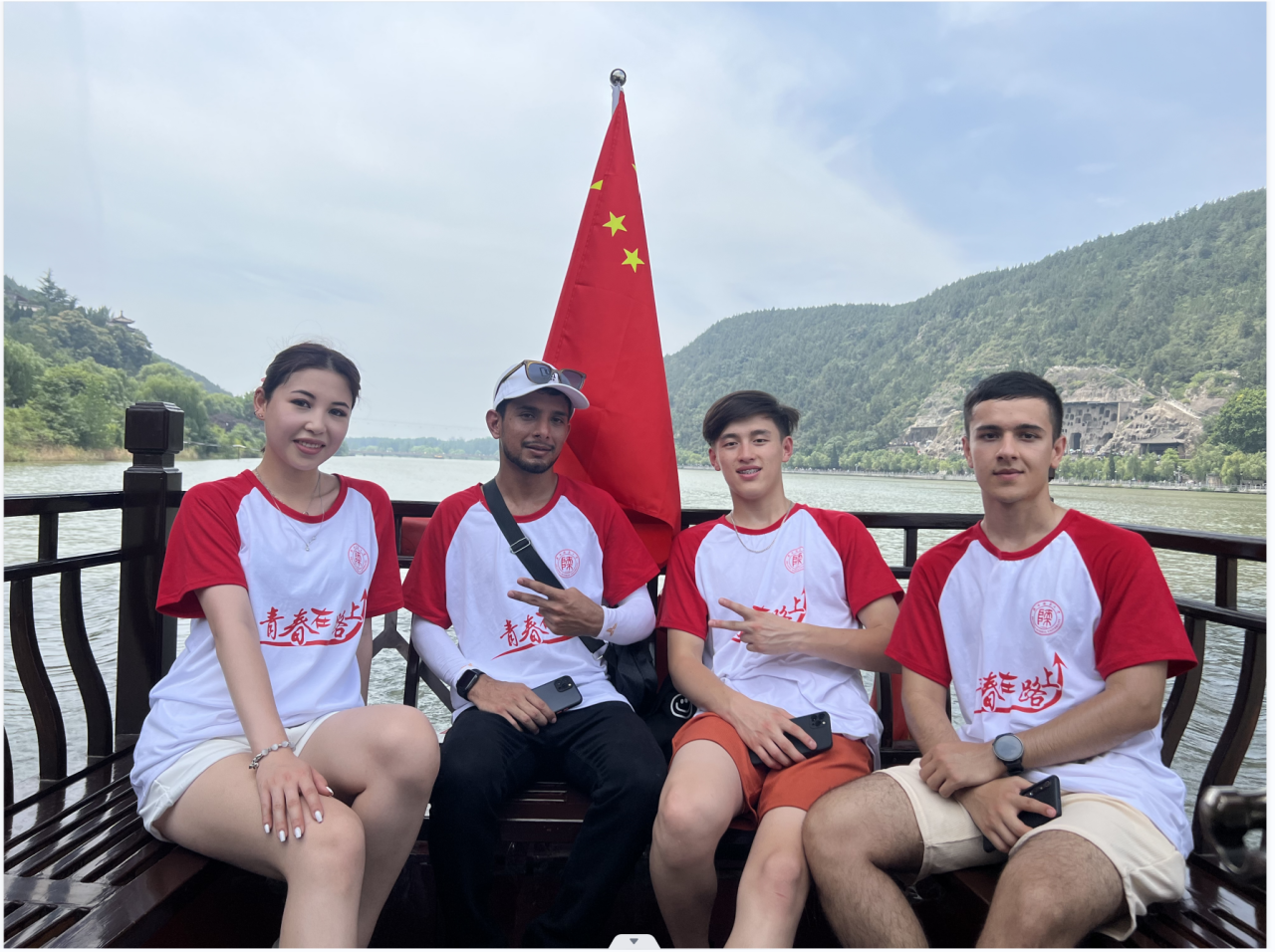 龙门石窟造像题记之多为中国诸石窟之冠,它们既是研究历史的佐证,也是中国古代劳动人民聪明智慧和创造才能的结晶。在讲解员的带领下,实践团的成员们先后参观了与“大禹治水”密切相关的禹王池、大型洞窟潜溪寺、摩崖三佛龛群雕等地,看到了天然形成的牡丹石和梅花玉,在宾阳三洞里体验了“与佛同萌”的趣味,也坐着船在伊河之上纵观了石窟的全貌。