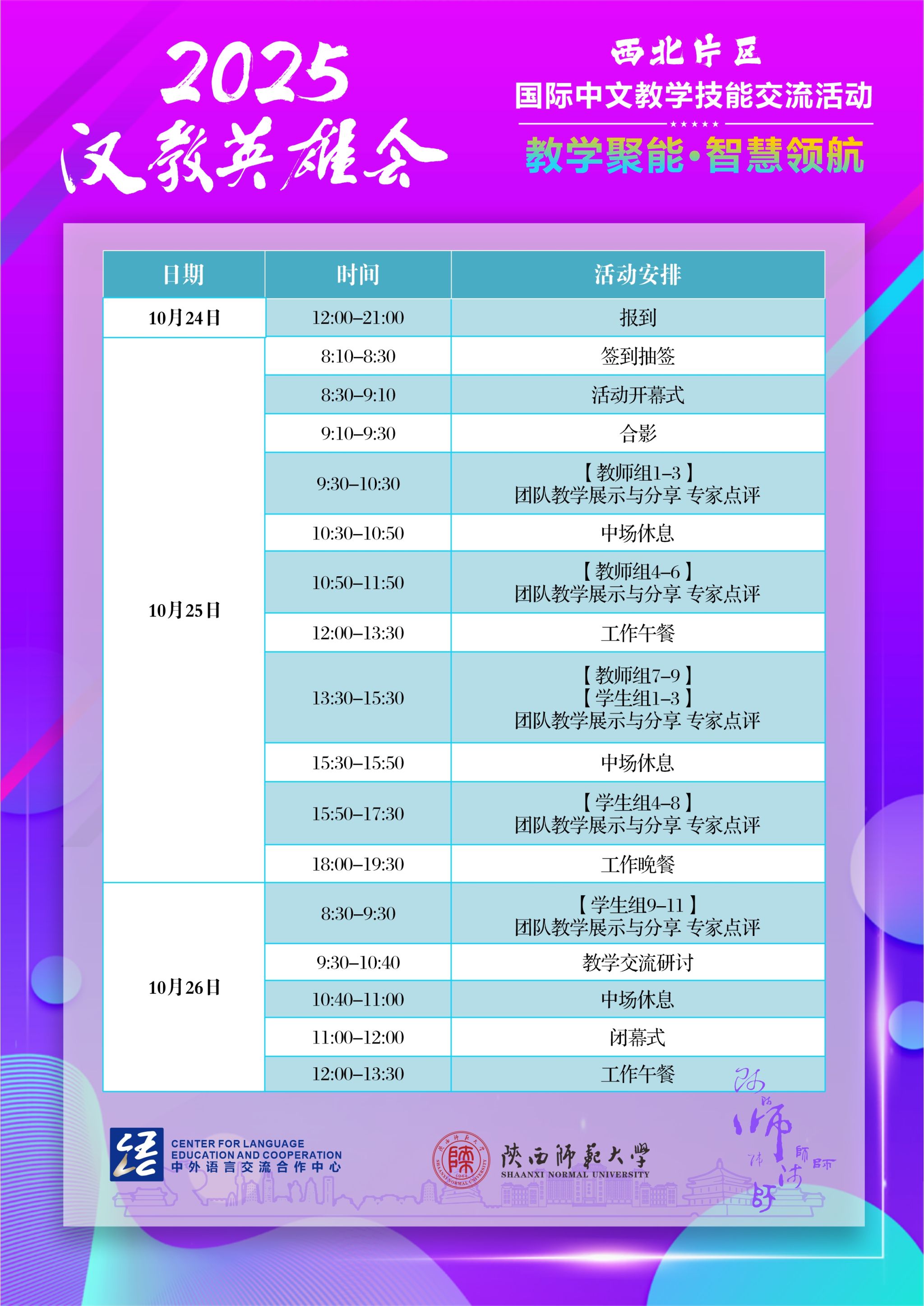 承办的2025年“汉教英雄会”国际中文教学技能交流活动(西北片区)将于2025年10月24日-26日举办。届时将有9支教师团队、11支学生团队进行教学展示与分享,诚邀各校师生观摩、交流!