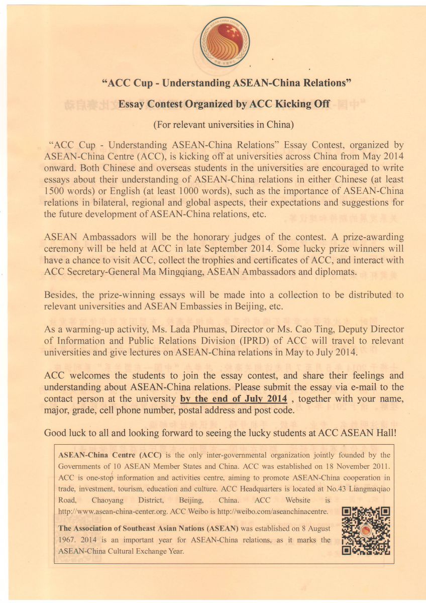 5月19日-23日ACC官员将访问我校,为我校院校师生提供主题为“中国-东盟关系”的讲座,并简要介绍中国-东盟中心及“征文比赛”的参与方式及规则等内容。